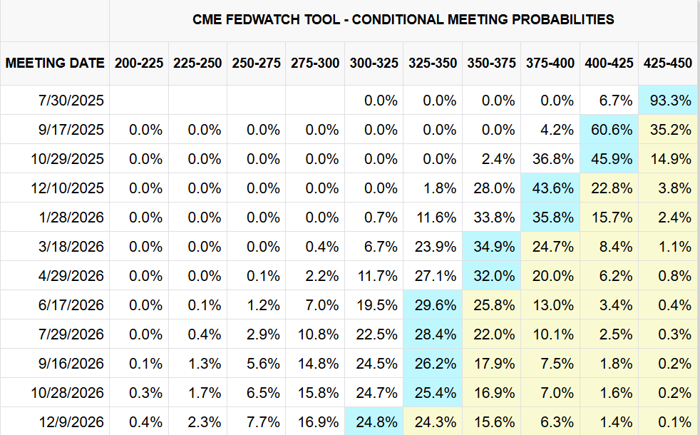 The Fed is clearly split and sweating. More members are leaning toward cuts, even if the public stance remains hawkish. Market odds haven’t caught up yet — but the tone has shifted.