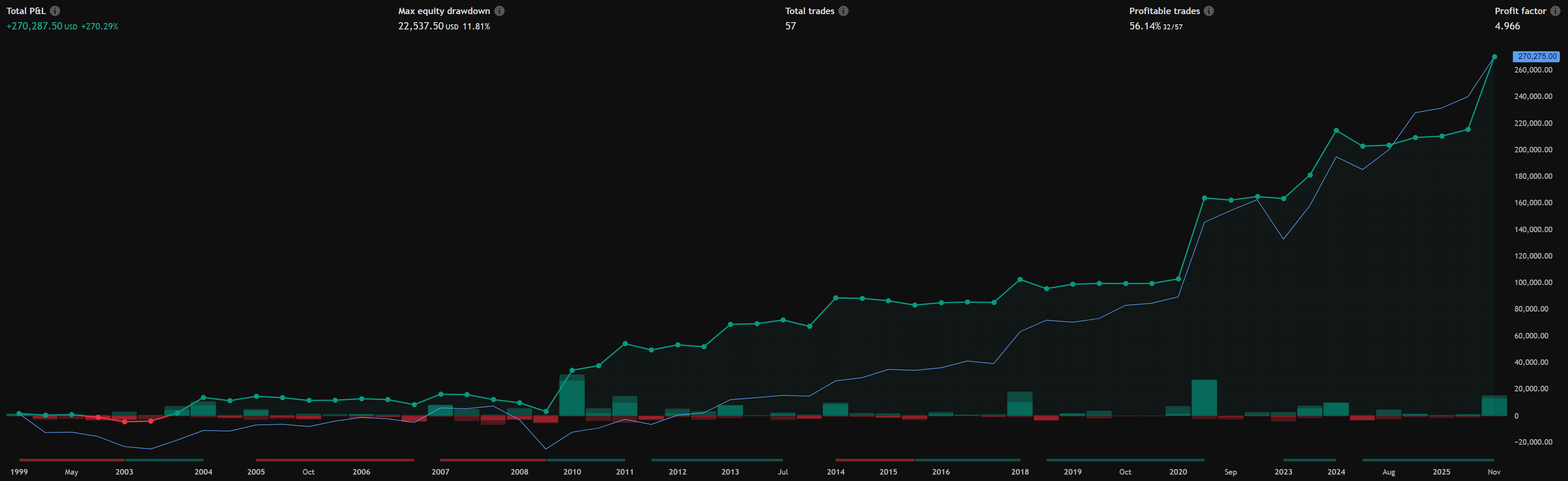 Backtest on ES1! from 1999 → now, with my current daily/weekly mix and settings: