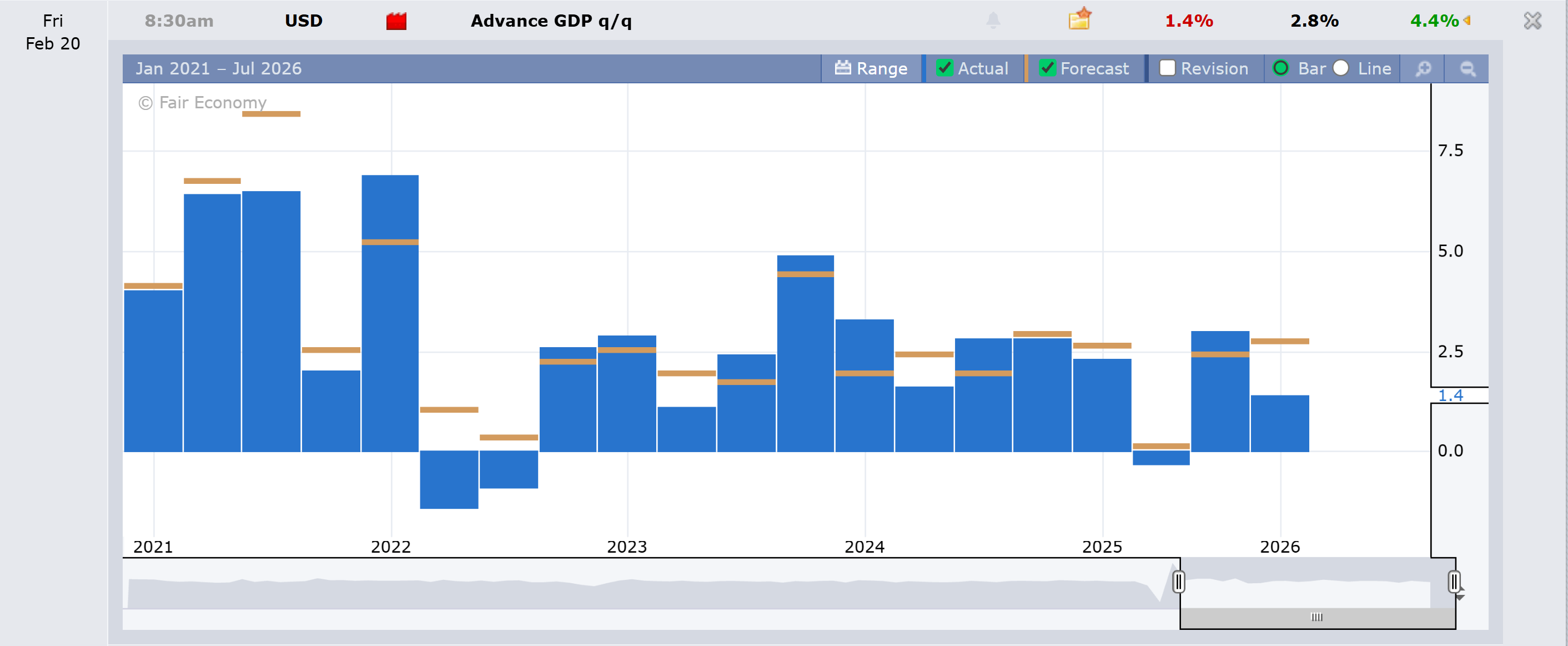 GDP came in at 1.4% QoQ against a 2.8% forecast and a 4.4% prior print. That’s not a miss, that’s a faceplant.