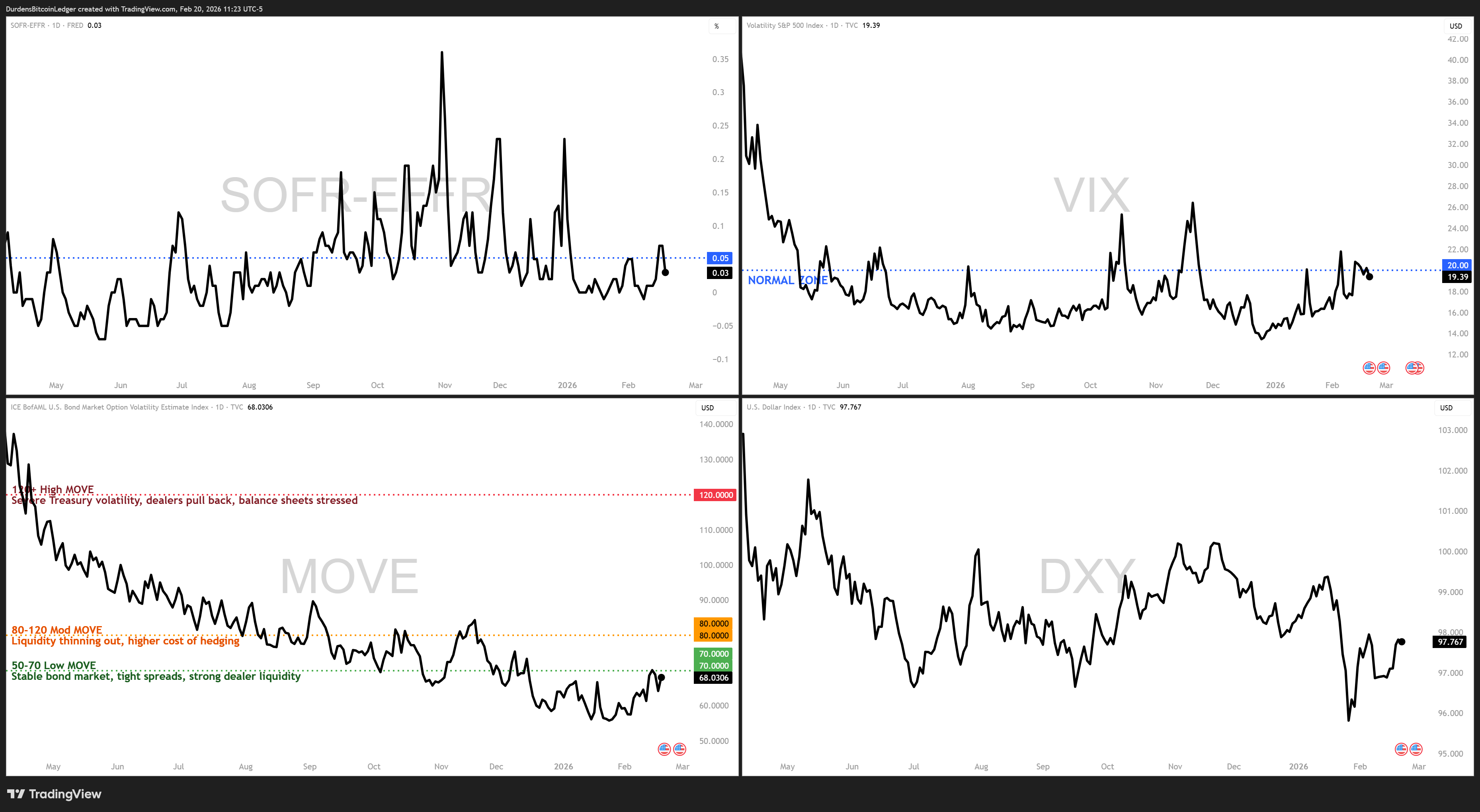 The stress dashboard is the more interesting story this week. SOFR-Fed Funds spread has crept back above the 0.05 level I’ve flagged as the danger zone. That means liquidity stress is present in the system. VIX is still elevated above 20. The dollar has rebounded. And the MOVE Index (bond volatility) has bottomed and is starting to creep higher.