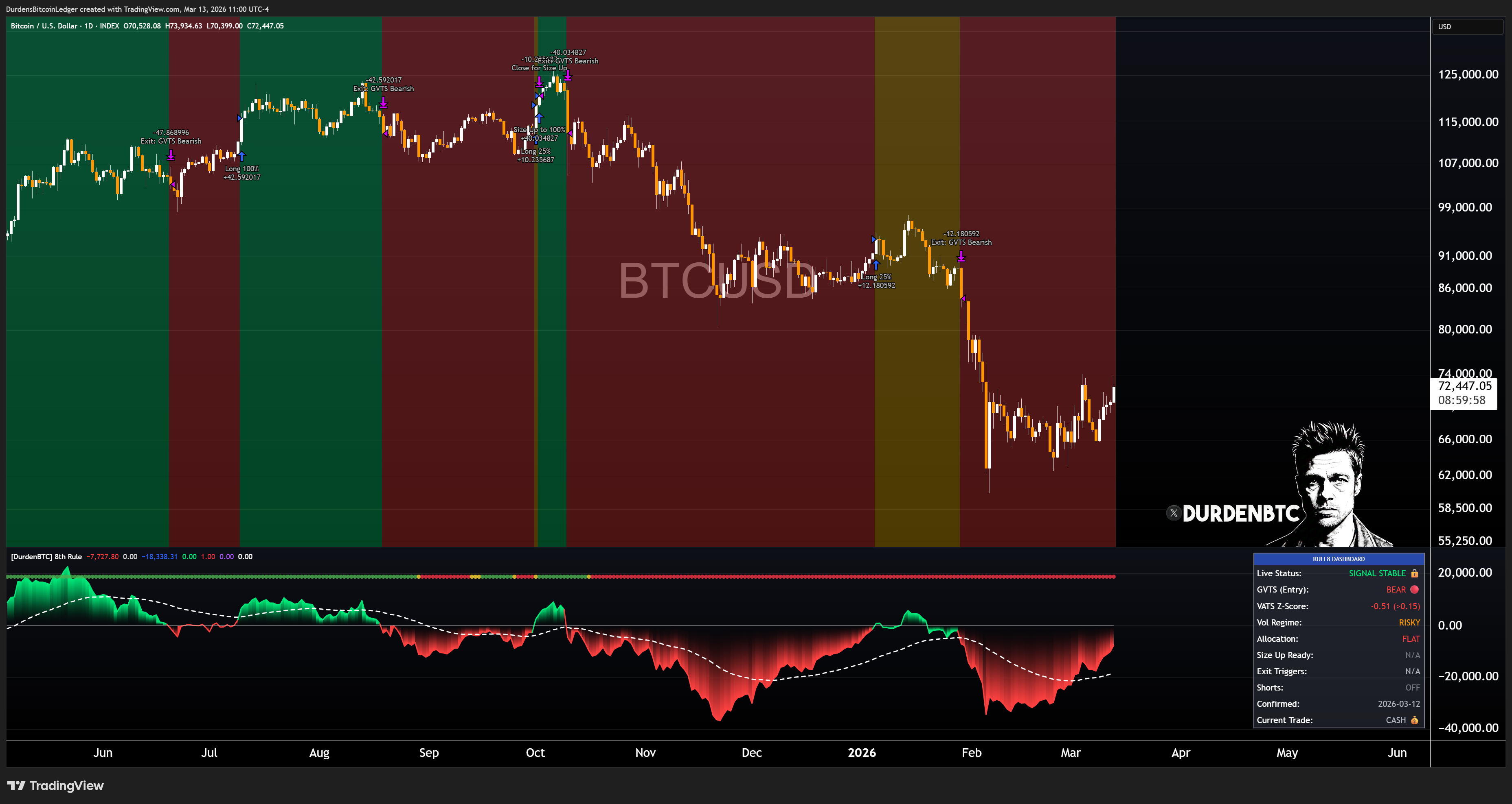 As of Friday morning, BTC is back up to ~$72,500. The 8th Rule hasn’t fired a long signal yet, but the price action is constructive. If it continues and we get a confirmed green, I’ll take the position.. and you’ll get the alert before anyone else.