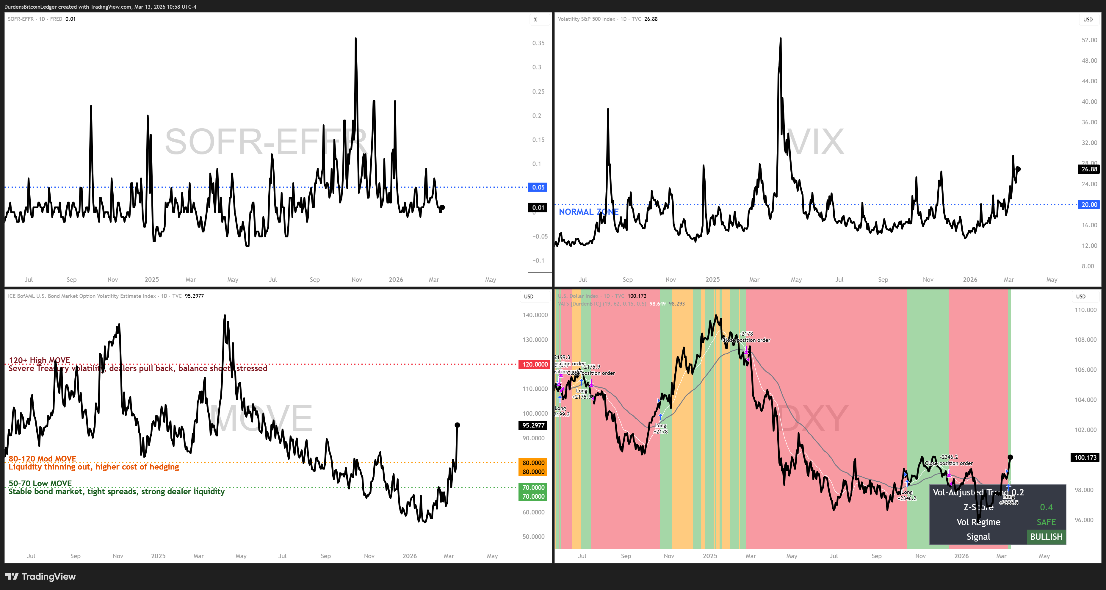 What makes this one particularly interesting is what’s voting bearish. I dug into the internals, and the equity components of the engine.. Nasdaq, European stocks, mega-caps.. are all still technically in bullish uptrends. The bearish votes are coming from the deeper macro layer: inflation expectations rising, commodities and oil breaking out, the Dollar flipping bullish, bond volatility surging (MOVE at 95), and the VIX expanding.