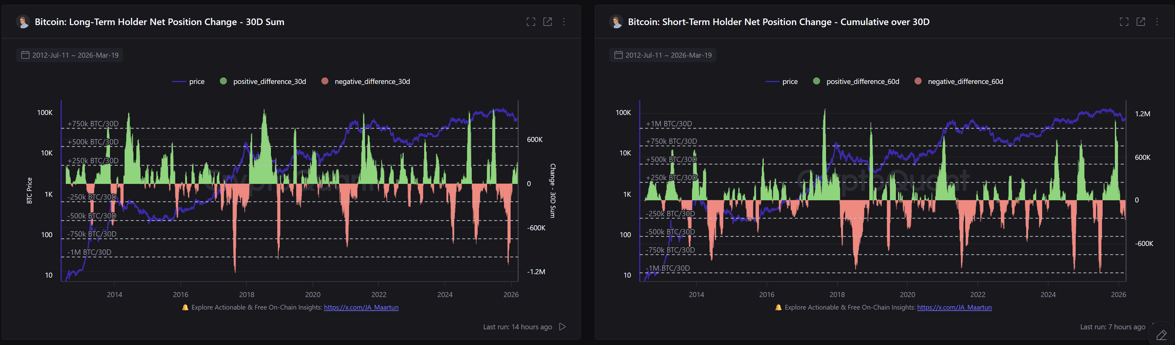 The most interesting development this week was the long-term holder / short-term holder divergence. Short-term holders peaked their accumulation at $90K, thinking we were going back to $100-120K. We did the exact opposite. Now they’re puking at the lows while long-term holders are quietly picking up coins at these prices.