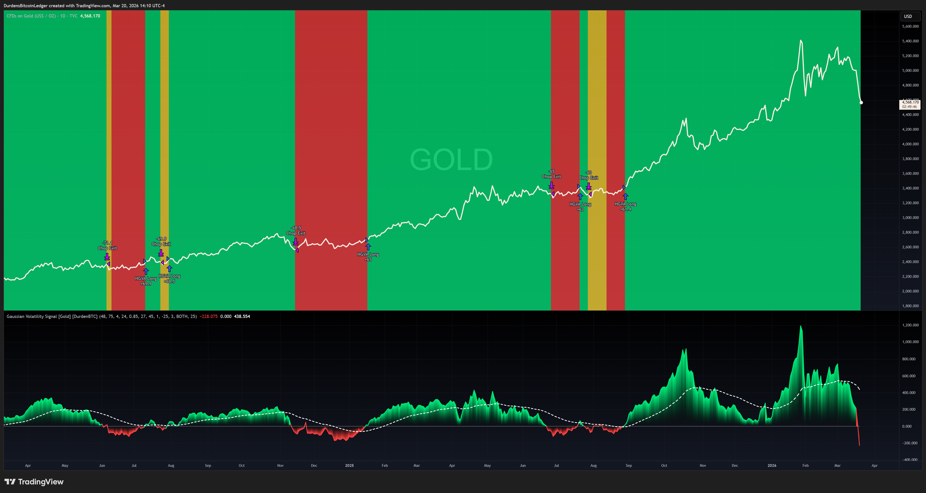 Gold.. the last position standing, flipped risk-off today. By close if that confirms (99% chance as of this writing), I’ll be fully out. Equities were already gone. Bitcoin teased a long at $76K and dumped back to the high $60s. The FOMC came in hawkish.. and not just “no cuts” hawkish.
