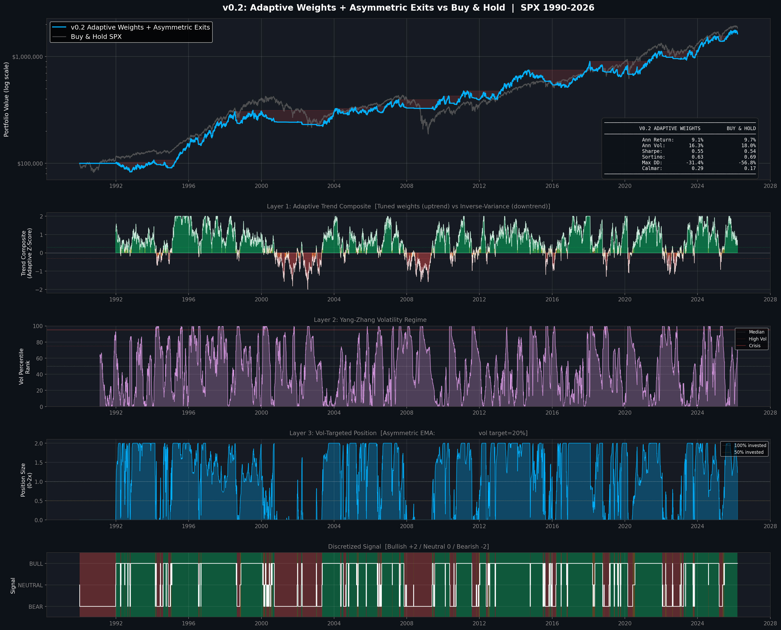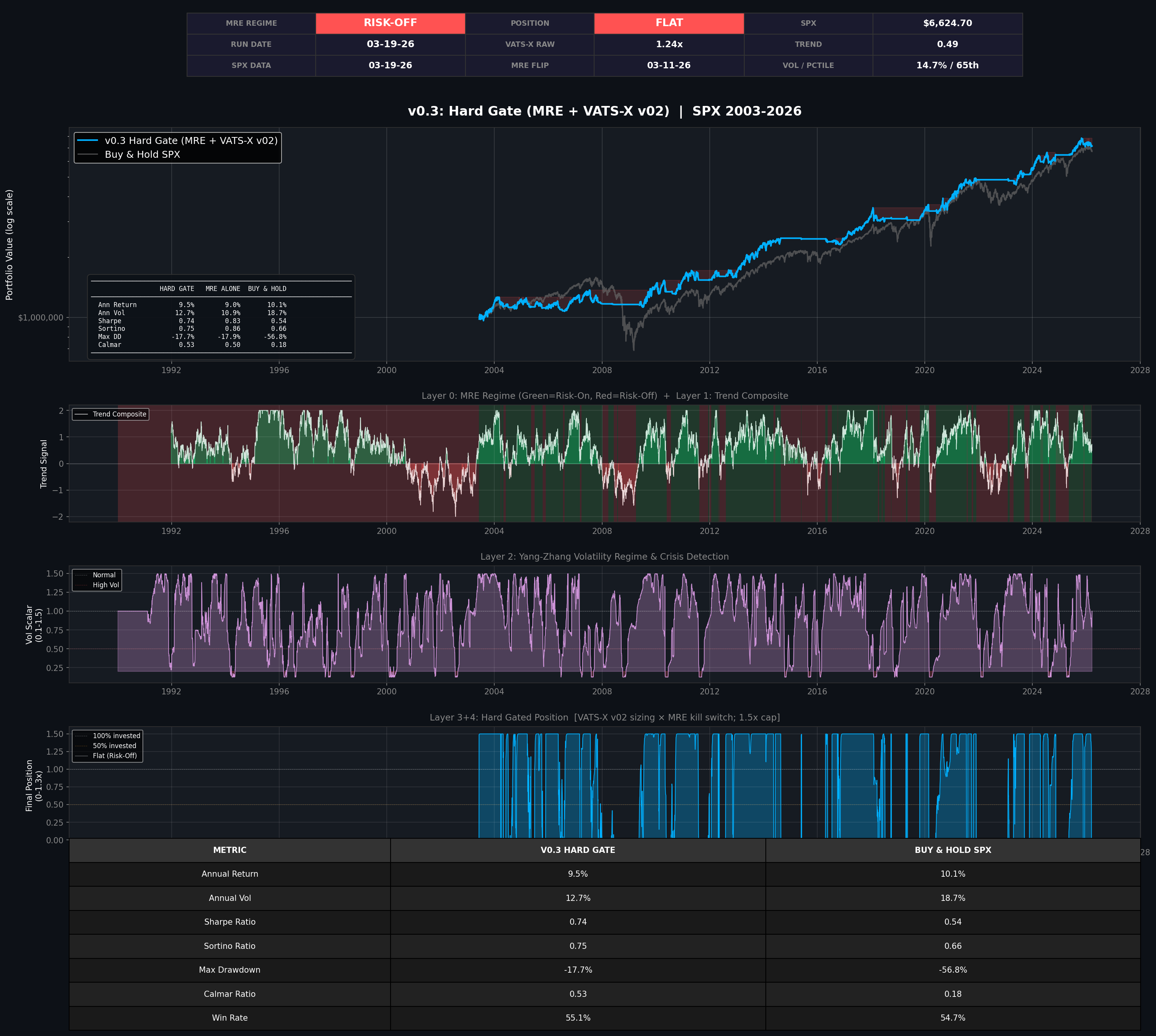 The solution: I built a new Python-based VATS engine (v2 with adaptive weighting) that can run independently outside of TradingView. When overlaid on the Macro Regime Engine as a position-sizing and trend gate for the equity sleeve, it significantly improved results going back to 2004. Calmar ratio of 0.53 on the SPX sleeve alone.