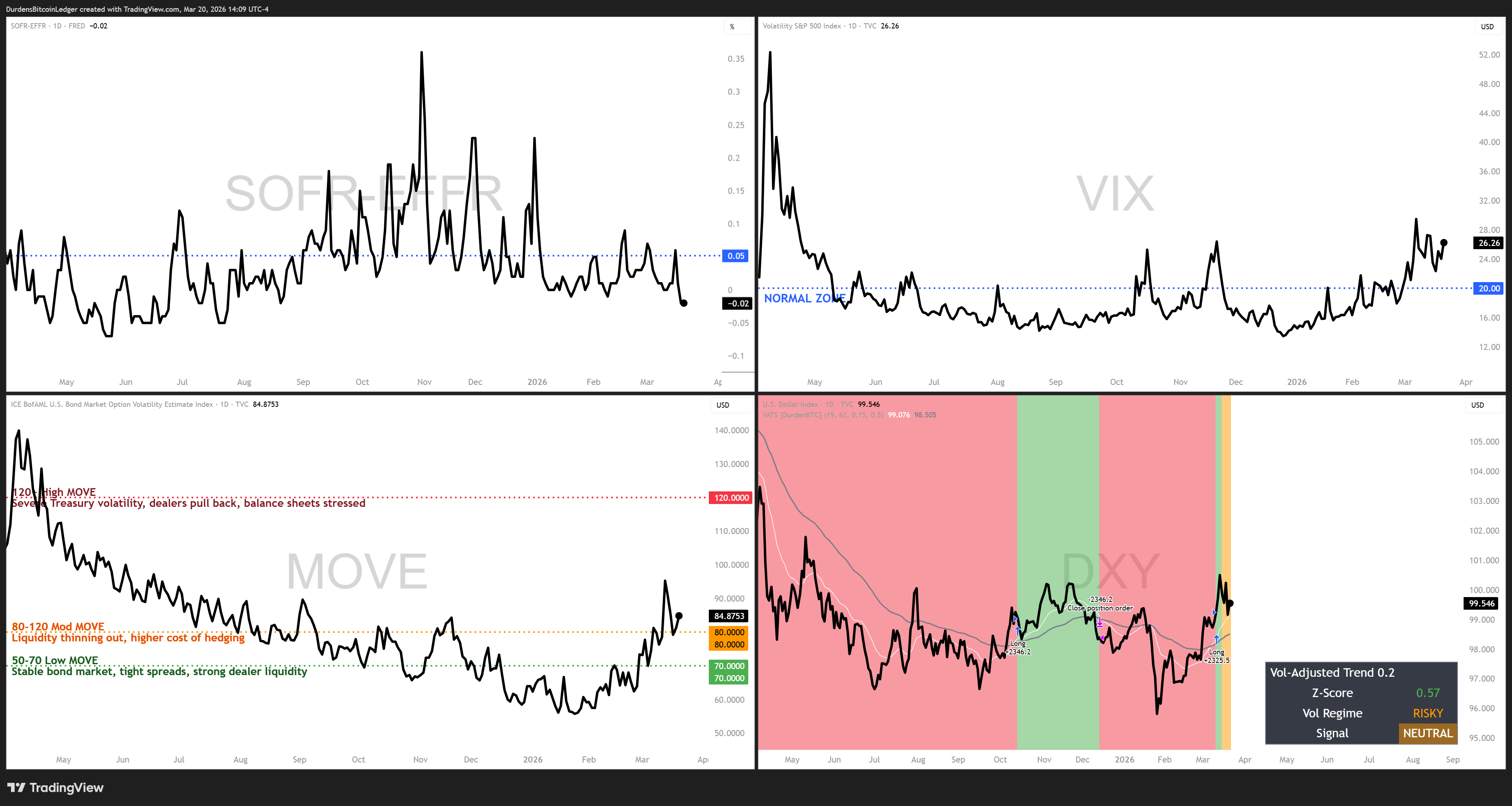The stress dashboard confirms it. SOFR/Fed Funds spread is back in negative territory (good.. liquidity plumbing is okay), but VIX is sustaining over 20, the Dollar has broken out bullish, and the MOVE Index is back above 80.