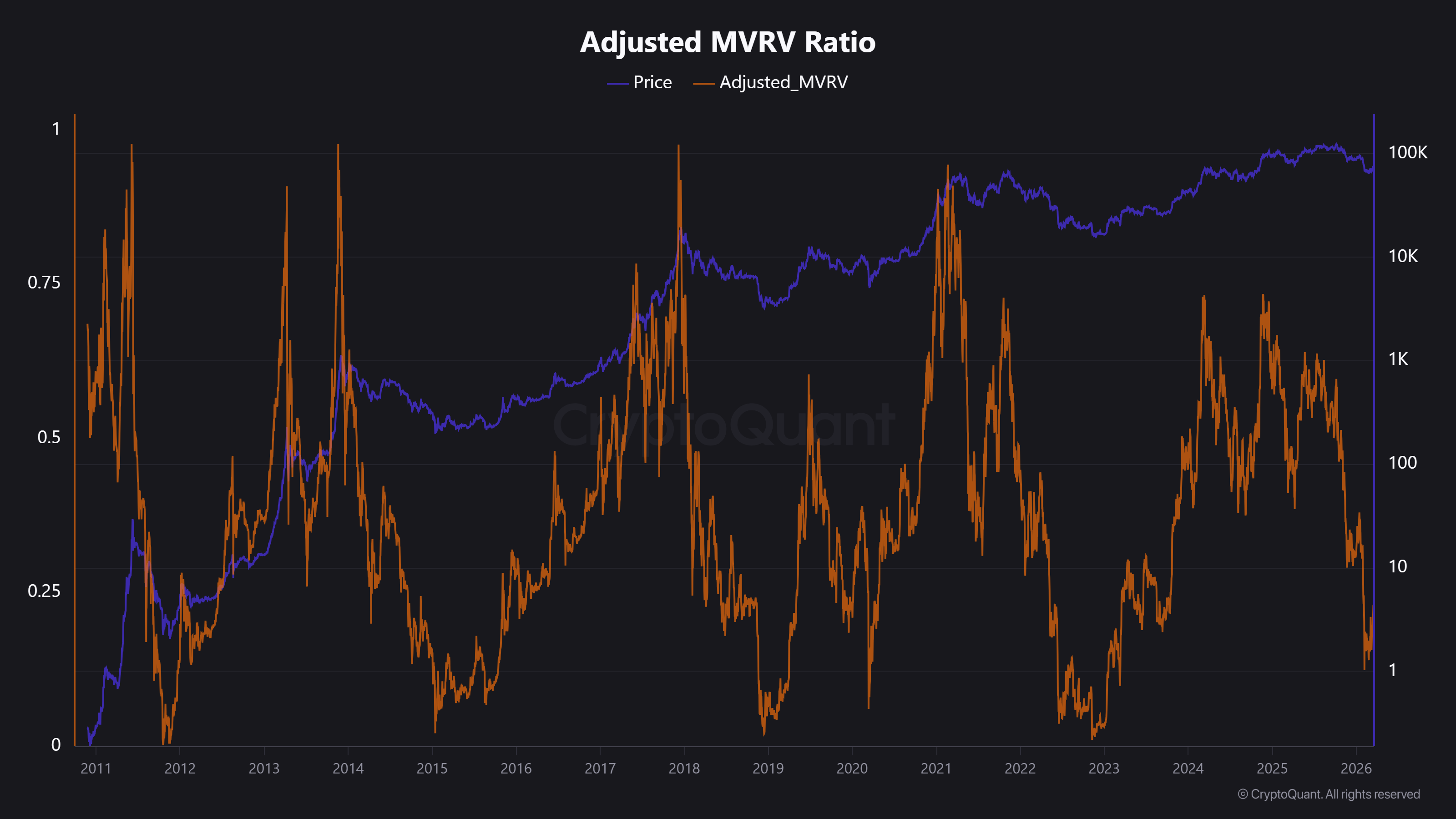 That’s textbook. Smart money accumulating, weak hands capitulating. Retail demand still in the dumps. Adjusted MVRV approaching cycle bottom levels but not there yet.