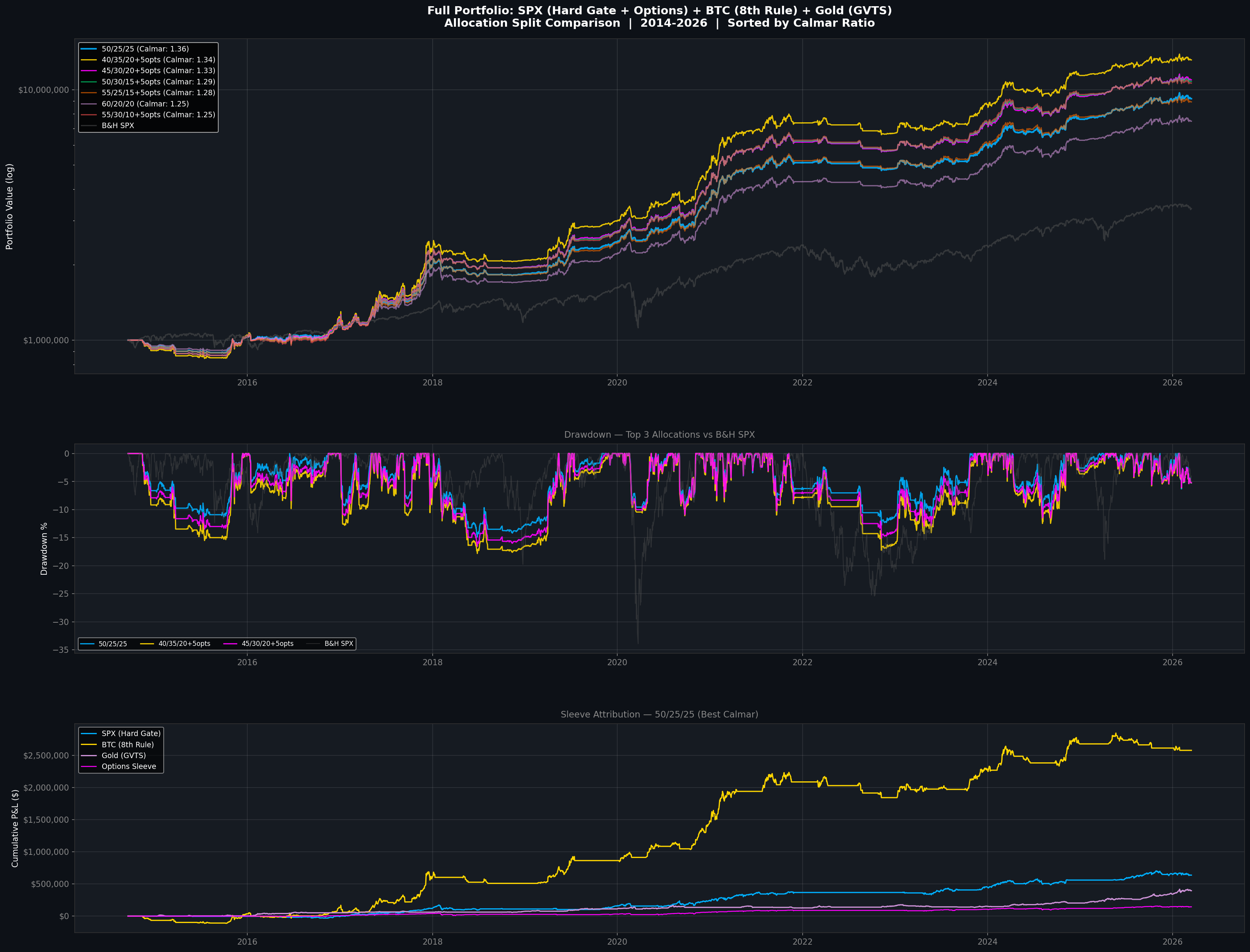 The problem: I’ve been running a 60/20/20 portfolio (60% equities, 20% Bitcoin, 20% gold) with a 3-5% options sleeve. When I ran the full portfolio backtest, this allocation had the lowest Calmar ratio by a significant margin.