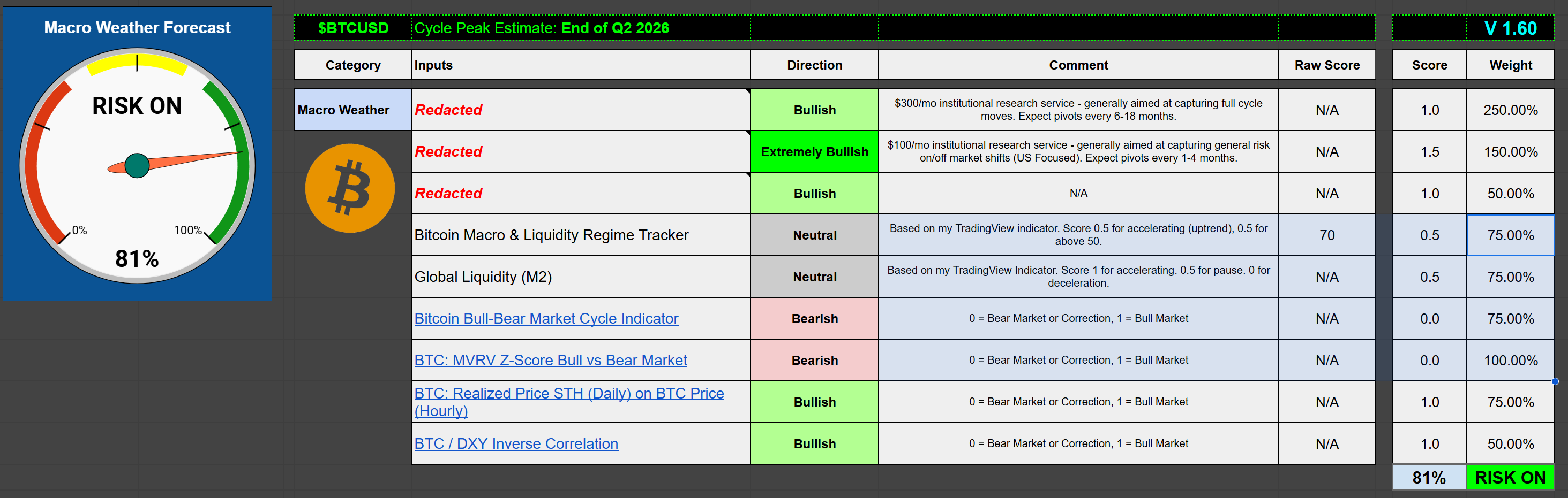 Score: ~81% risk-on after a small cool-off; drivers were Regime Tracker + Global M2 flipping from bullish → neutral.