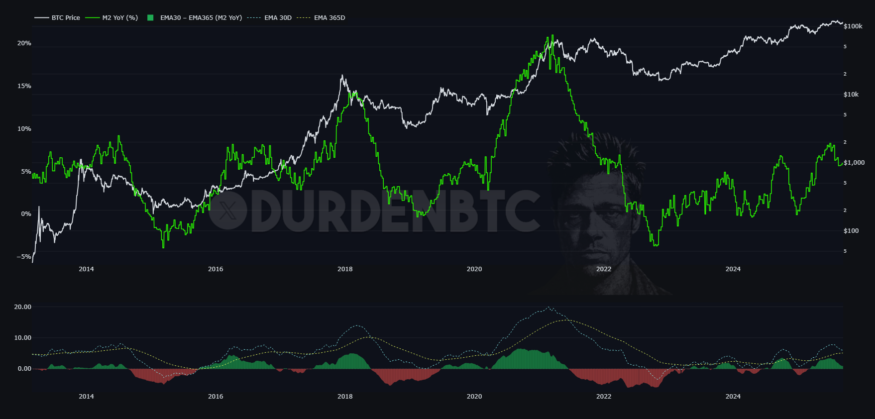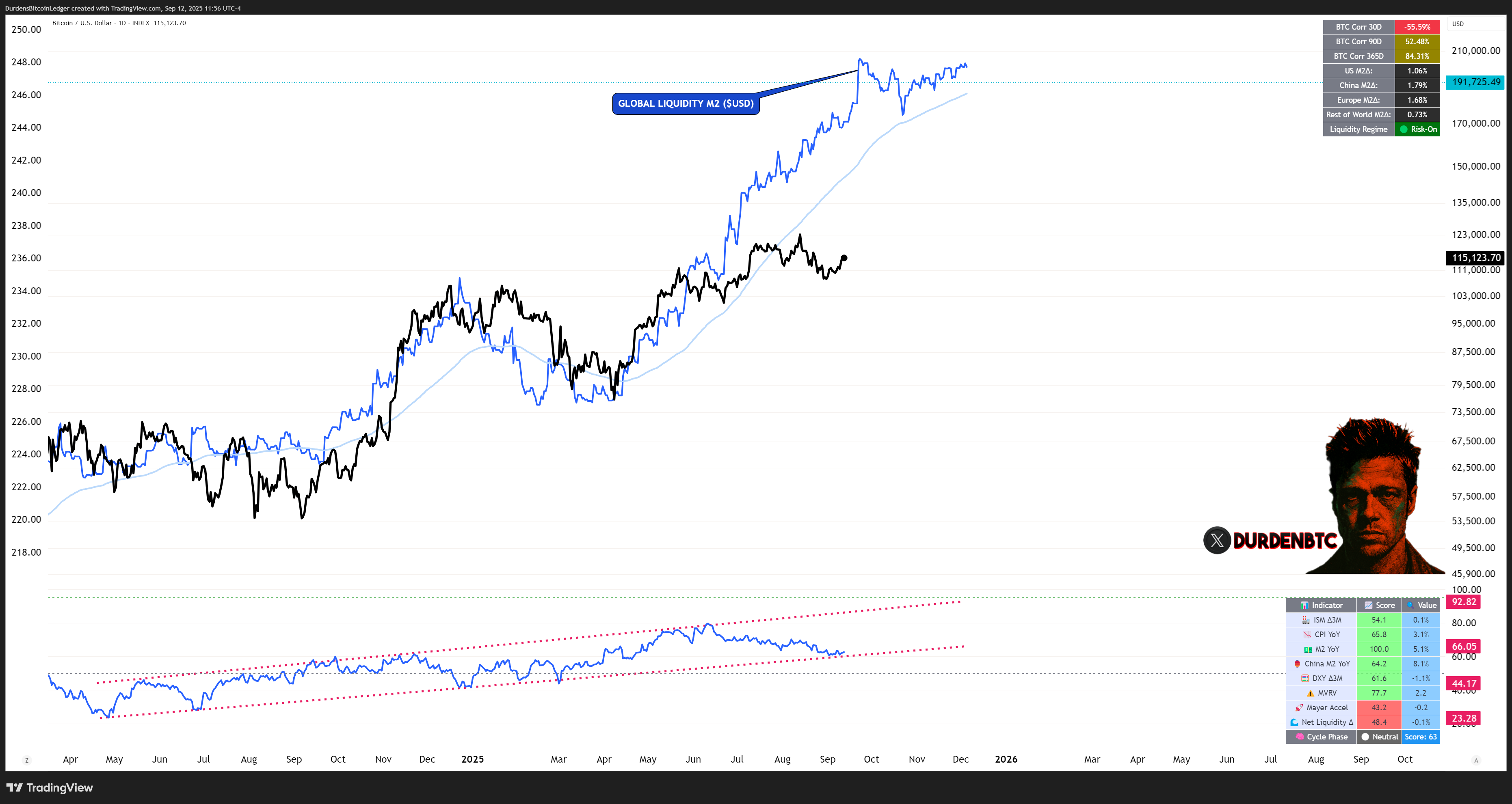 Liquidity pulse: M2 base → slow expansion; not ATH, but constructive.