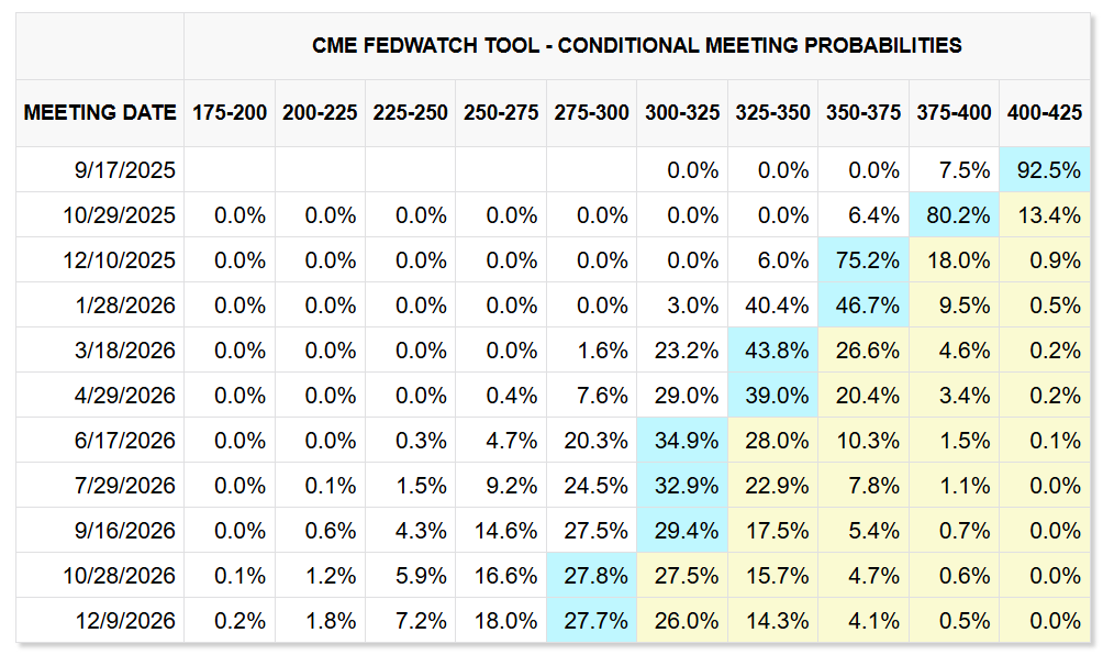 Base case: 25 bps in September; 50 bps odds faded (~7%).