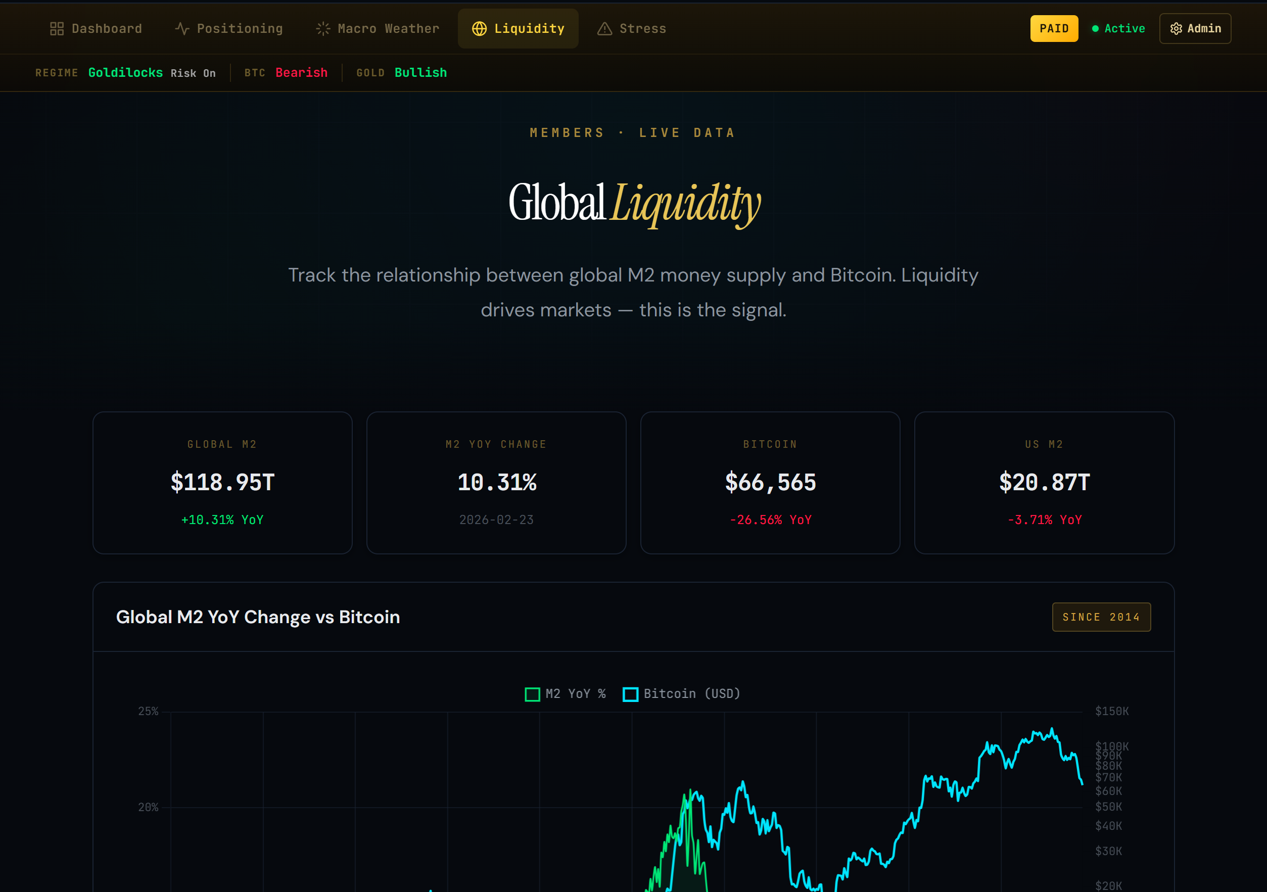 Global Liquidity: Global M2 money supply tracked across 21 economies, plotted against Bitcoin with rate-of-change analysis. The liquidity pulse that drives risk assets, visualized in real time.