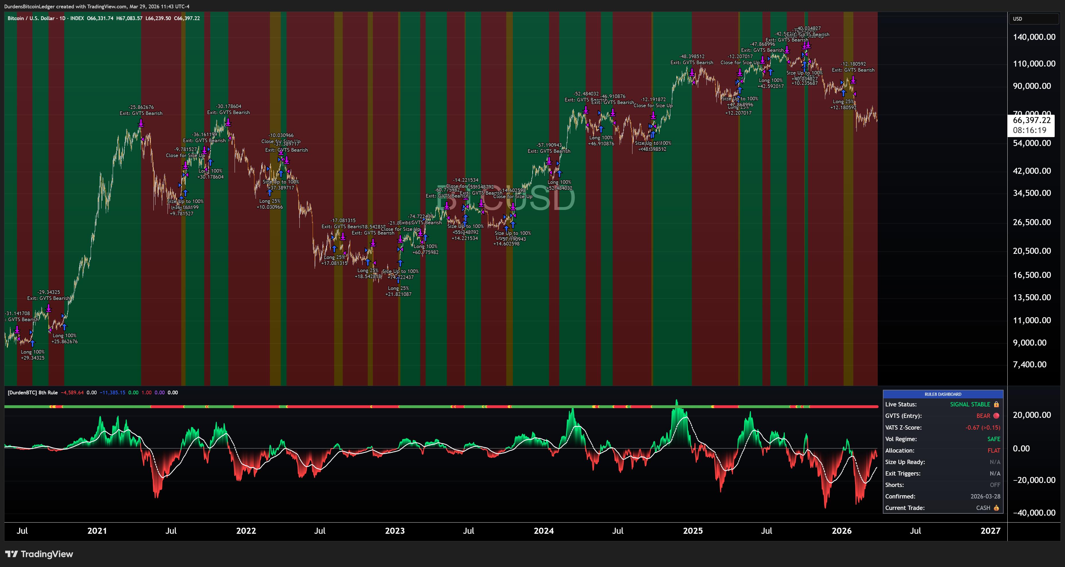 For Bitcoin & (Gold) , I built a separate engine: The 8th Rule.. a dual-speed Gaussian volatility trend system. Where the MRE polls 20+ global assets, The 8th Rule runs two independent signal engines at different speeds on the underlying asset itself.