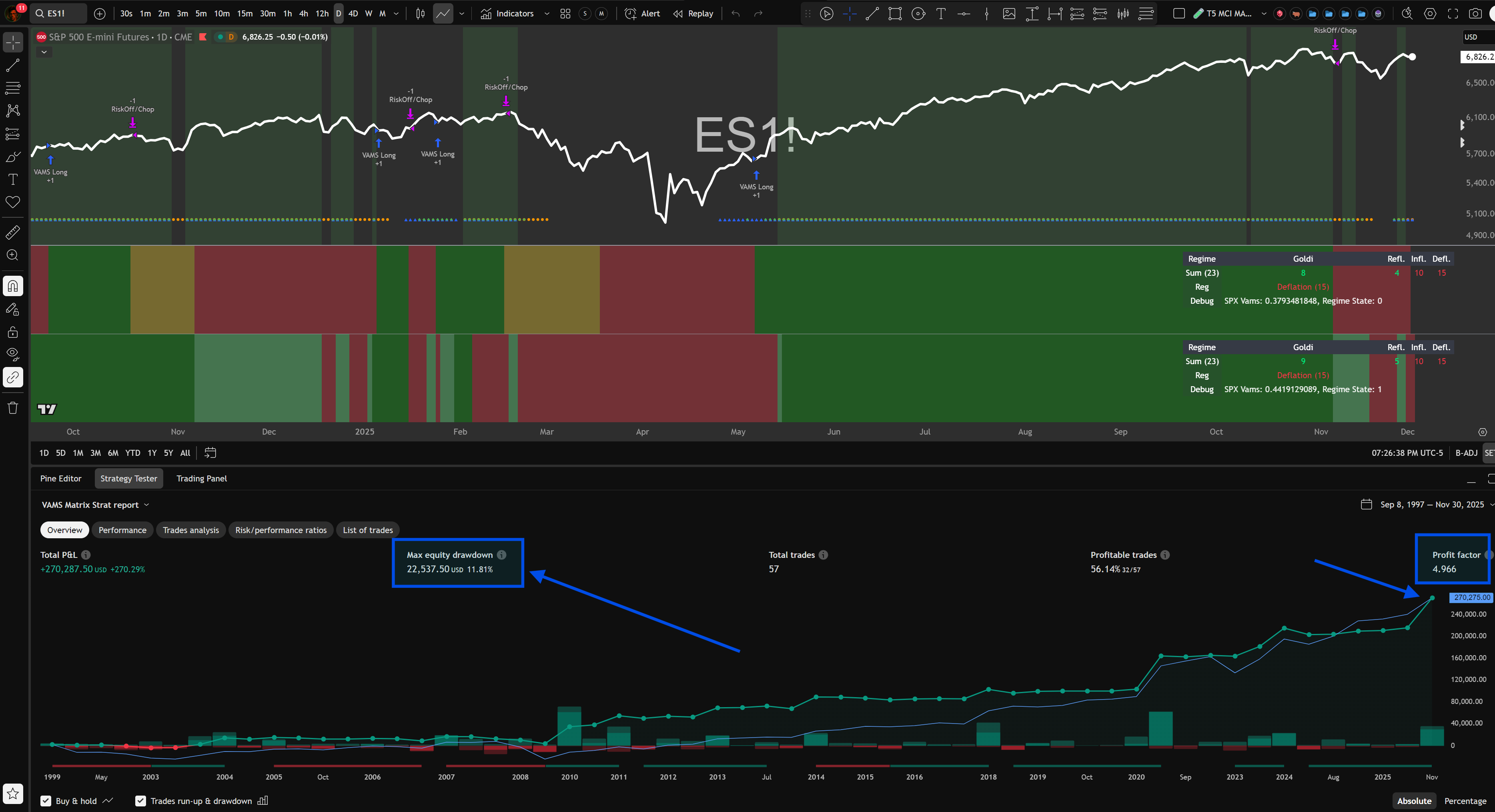 Last updated: March 2026. All performance figures re-audited against TradingView backtest export on CME E-mini S&P 500 futures (ES1!) from August 1999 through March 2026. $1M initial capital, $1 commission, 1-tick slippage. Non-repainting.