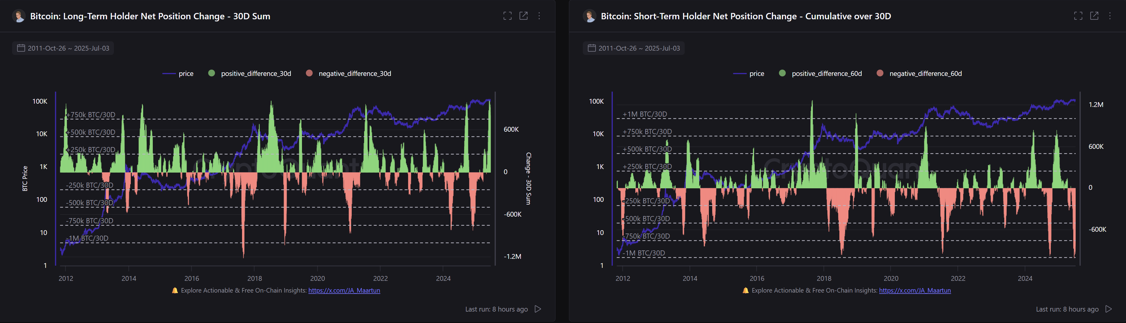 LTH (Left) on a buying spree not seen since 2018. LTH is generally considered to be “Smart Money”, STH (Right) is generally retail and meant to be faded.